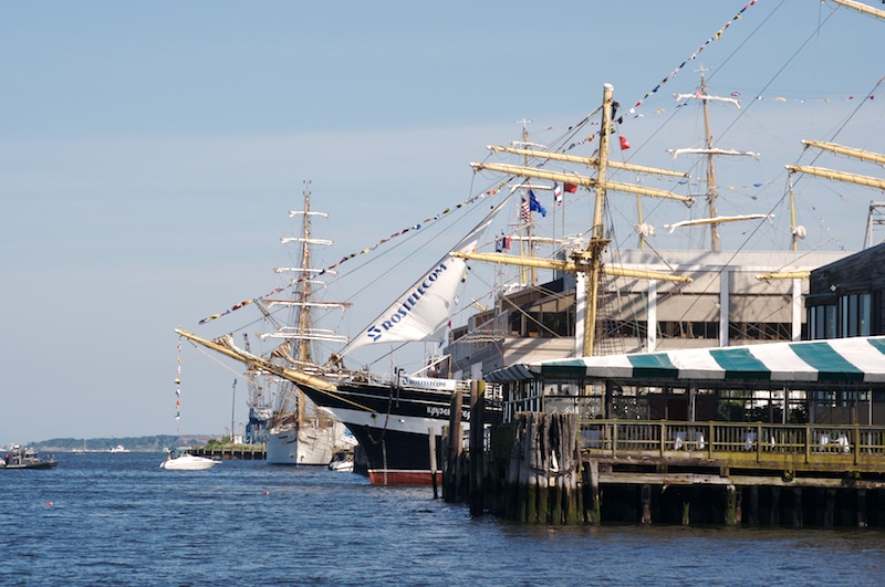 , a full-rigged ship launched in 1999 and based in Rio de Janeiro, looms behind the prow of the