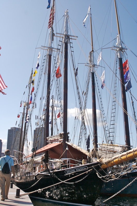 Caption: The Nathaniel Bowditch and the Lewis R. French, a topsail schooner and schooner respectively, at the Fan Pier. The Nathaniel Bowditch was launched in 1922 and is based in Rockland, ME; the Lewis R. French was launched in 1871 and is based in Camden, ME. (July 9, 2009)
