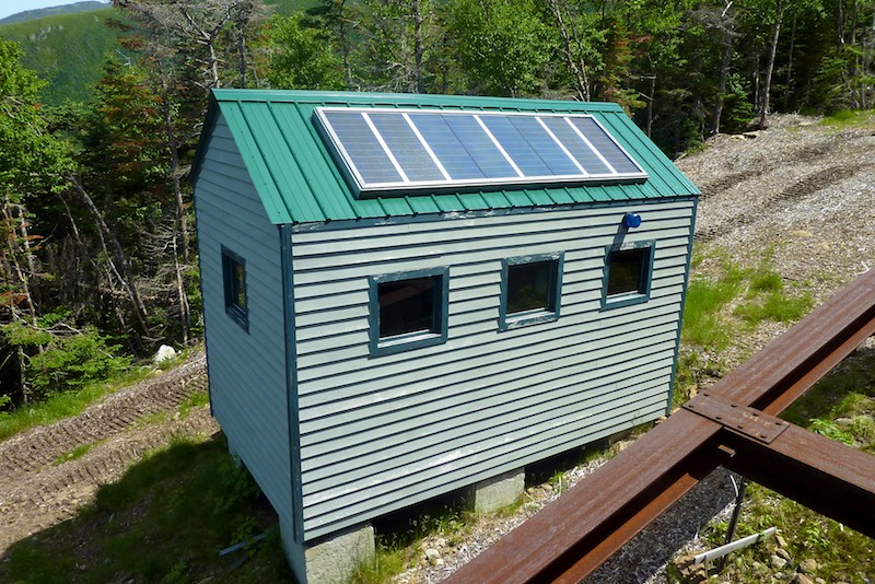 The switches at either end of Waumbek Siding are solar-powered. This is the hut containing the power equipment for the upper switch. (July 3, 2010)