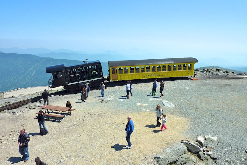 Looking east at M-2 and coach 1 at the summit, in a shot taken from the observation deck. In the background to the left of the locomotive can be seen Wildcat Mountain Ski Area. (May 31, 2010)