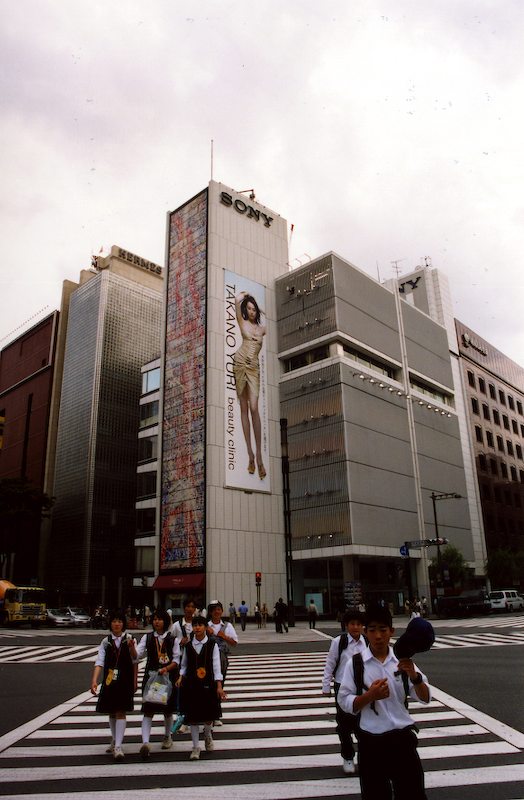 The Sony Building, where you can go see the latest Sony products, and even try them out. Note the crosswalks going diagonally across the intersection. These are common at intersections that have a lot of pedestrian traffic.