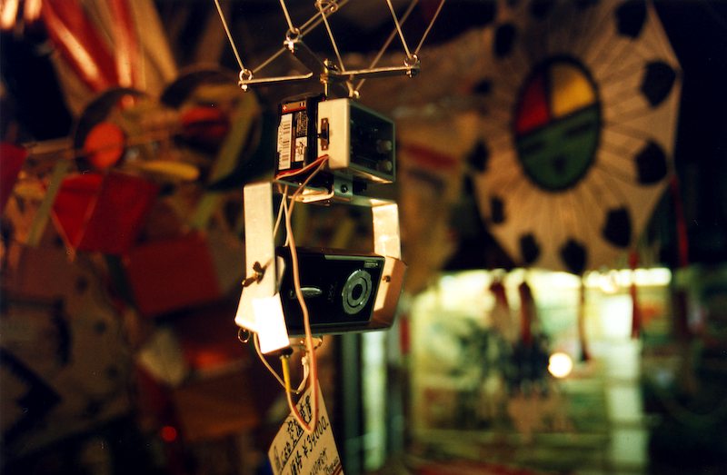 Caption:One kite had this odd apparatus attached to it. After studying it for several minutes, we realized that it's a remote-controlled digital camera. There's a radio reciever above the camera, along with a motorized pivot so that the camera can be aimed independently of the kite. The red and white wire coming down from the receiver is hooked up to an infrared LED, which simulates the camera's remote.