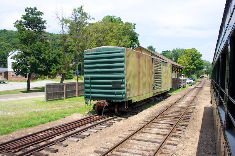 An old Maince Central boxcar built in 1951 is parked outside the Deep River freight house. It is apparently used as a workshop for maintaining the Becky Thatcher. (July 24, 2010)