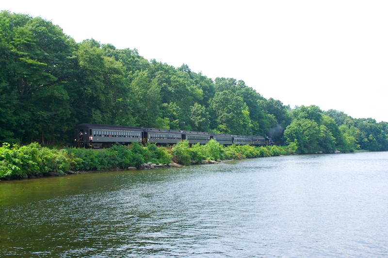 Immediately north of Deep River is one of the places where the railroad runs right alongside the Connecticut River. The train is backing down to the station. (July 24, 2010)