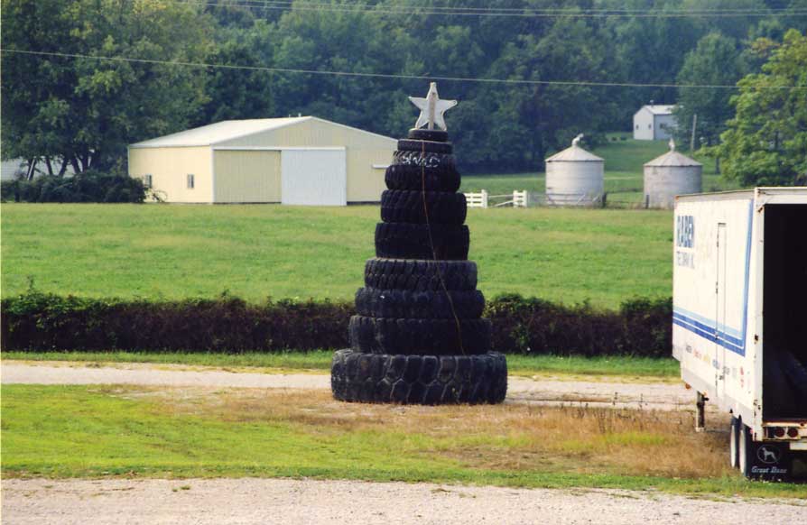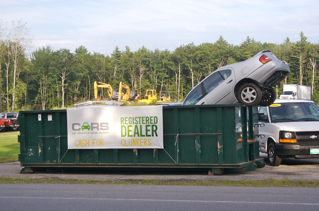 The GM dealership in Arundel, ME stuck a car in a dumpster to advertise its participation in the federal "Cash For Clunkers" program.