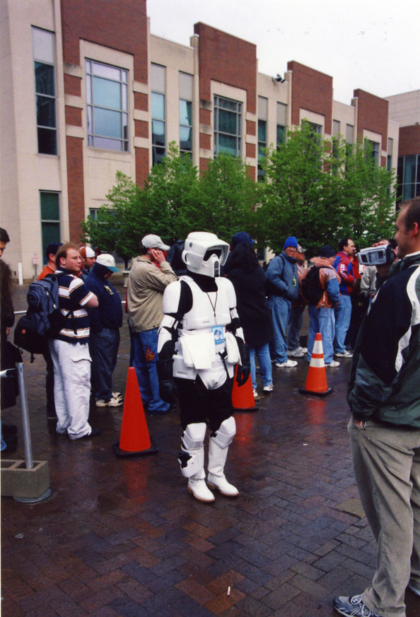 At Star Wars Celebration III there were a number of Imperial stormtroopers around to keep things under control. I caught this scout trooper outside giving directions. Unfortunately I wasn't able to get inside, as all the tickets had been sold before I got there at 9:30 AM (it didn't even open until 10!). The 2 lines to get in were huge, stretching at least a block around the building in both directions from the entrances.