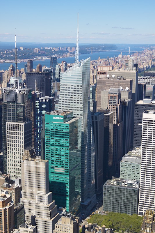 View of the Verizon Building (which says MetLife on the south side) and the Bank of America Tower just behind it. The latter was completed in 2009. (September 14, 2010)