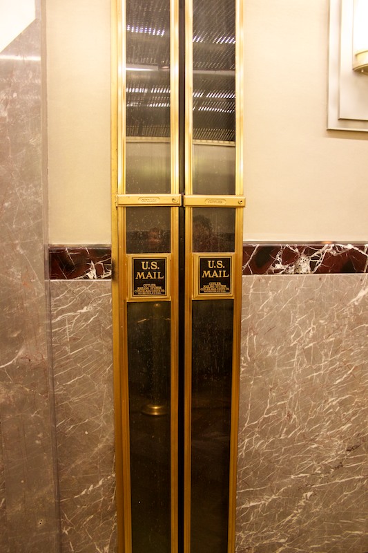 The Empire State Building has a Cutler Mail Chute system, but I don't know if it's still in use. (September 14, 2010)